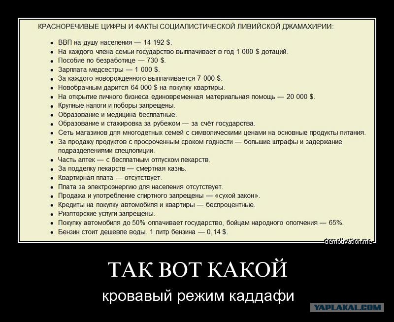 Вот это балабольство, что "до Каддафи Ливия была пиздец страна, а он пришел и заебись стало" - это такая же глупая поебота для школьников как: Путен уровень жизни взял сам и поднял. Захотелось вот просто.